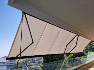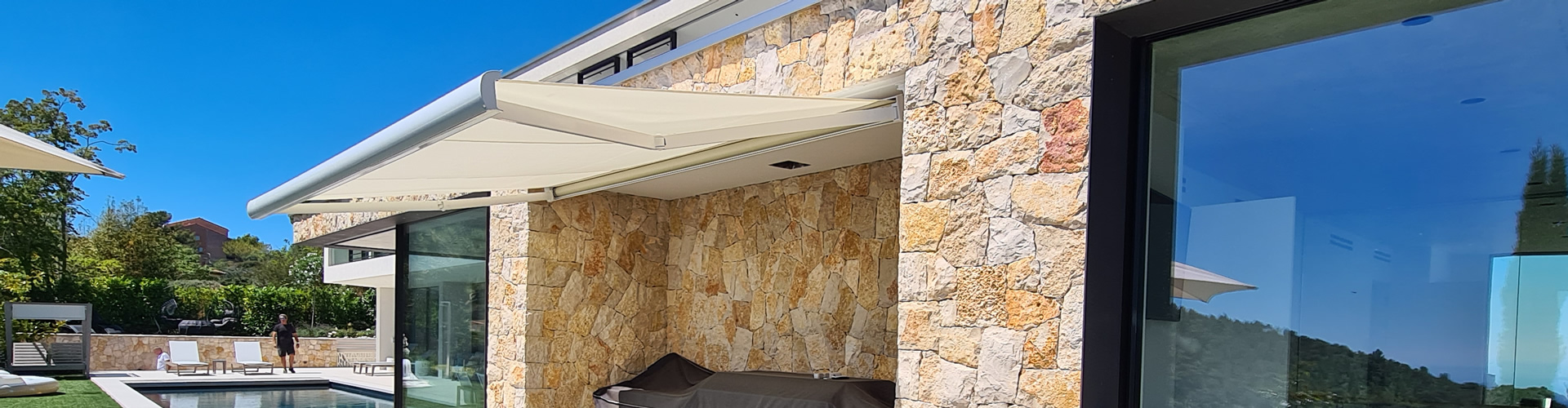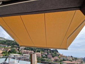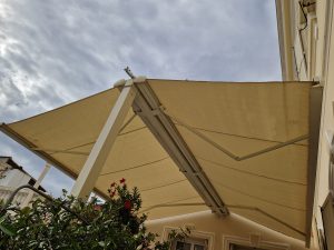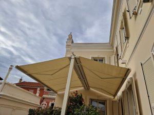 Stores tendus Gibus – faciles à installer, pratiques à ouvrir et fermer grâce aux coulisses et au système motorisé. Ils permettent de protéger du soleil ou de la pluie une grande véranda, une pergola existante ou un toit vitré.